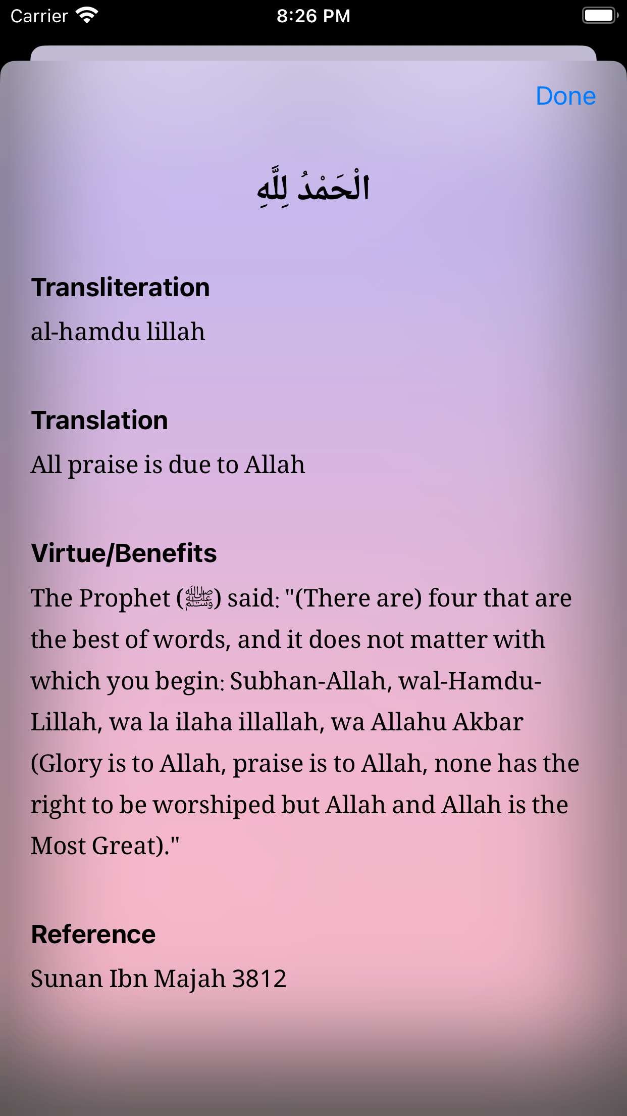 While selecting a zikr, long press any zikr to view the translation, transliteration, virtue and accurate reference for the zikr.